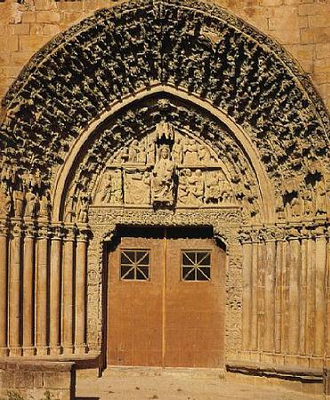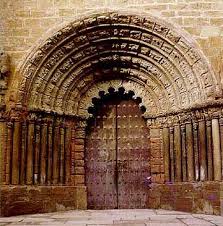 8.Portada romànica:Rodeando el semicírculo existirán invariablemente una serie de arquivoltas o conjunto de molduras concéntricas que descansarán sobre columnas a ambos lados de la puerta. La unión de las arquivoltas a las columnas se realiza a través de los cimacios, piezas salientes y cuadrangulares que van sobre los capiteles, normalmente historiados. A menudo los cimacios se fusionan formando una imposta que recorre horizontalmente ambos lados de la portada por encima de los capiteles. Las propias arquivoltas son intensa y a veces ingeniosamente utilizadas para retratar mil situaciones, elementos geométricos, personajes, leyendas y pasajes bíblicos. A veces la arquivolta exterior está enmarcada por una moldura semicircular llamada guardapolvos que, como una arquivolta más, enmarca todo el conjunto