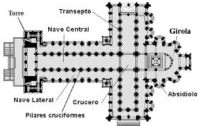 6.Planta de cruz latina:La planta de Cruz Latina tiene dos brazos, uno longitudinal y otro transversal llamado transepto. Donde se cruza la nave central y el transepto, se llama crucero, que suele realzarse con una cúpula.